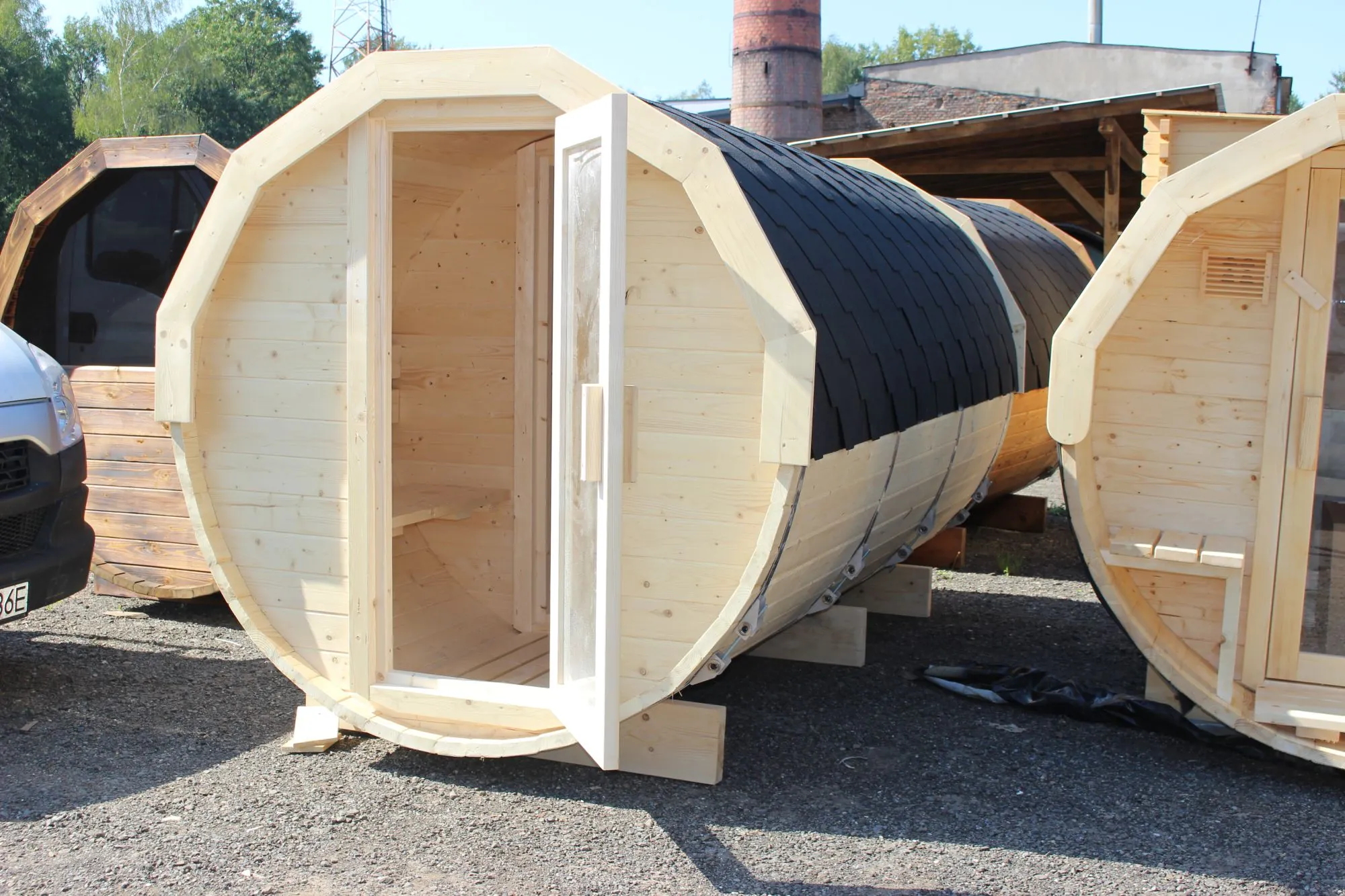 The 3.5 m THERMO barrel garden sauna with vestibule is a model designed by a group of enthusiasts and true professionals from Domki Sauny. With attention to the smallest details and by using certain materials, it is a particularly solid construction. Its walls were erected using 45 mm thick planks of spruce wood. This is sourced from forests, which means that it is fully organic and free of any harmful substances. Nevertheless, the use of THERMO wood plays the first fiddle here. This makes the saunas resistant to all kinds of damage and deformation caused, for example, by moisture. Protection from adverse weather conditions is also provided by a roof secured with roof shingles. The structure itself is supported by 4 metal brackets. Although it is undoubtedly stable, it is recommended to place it on a hardened surface.
