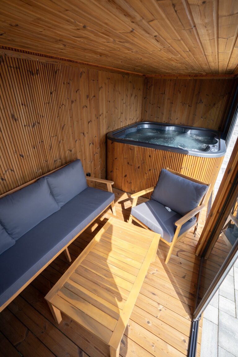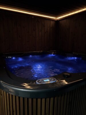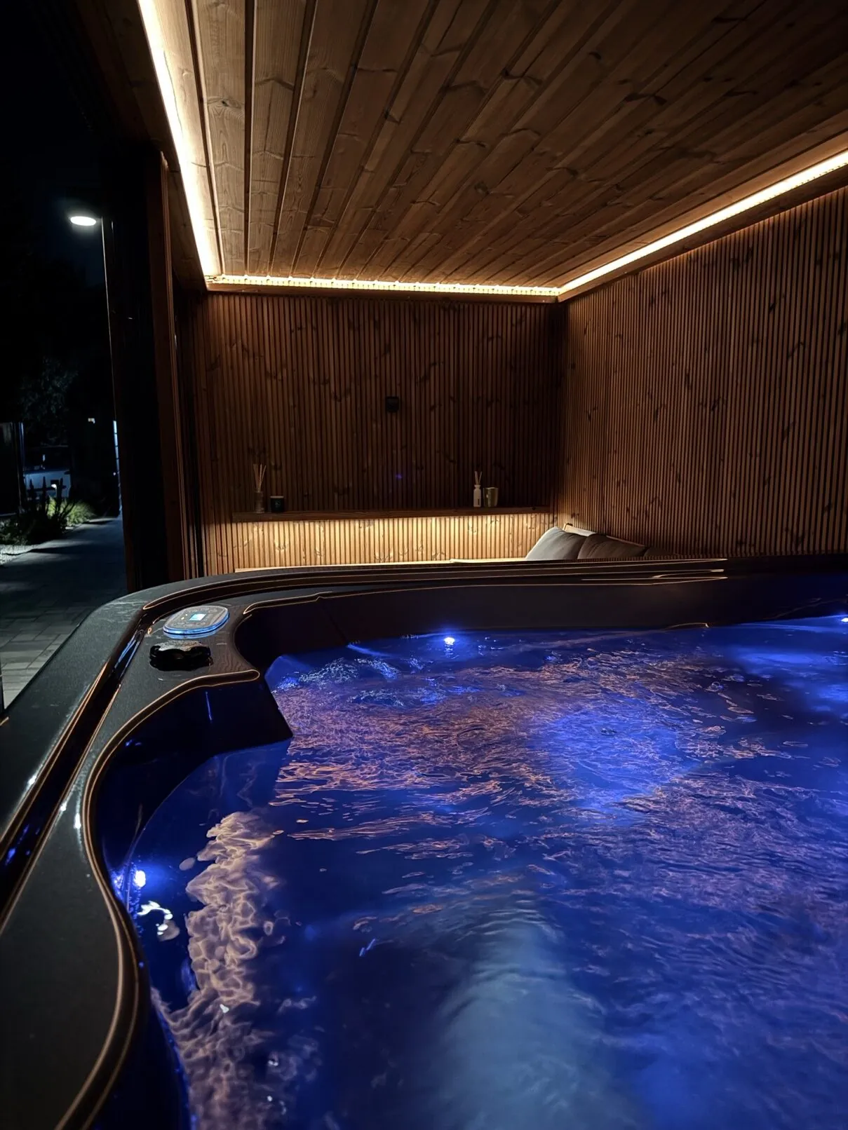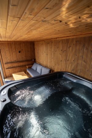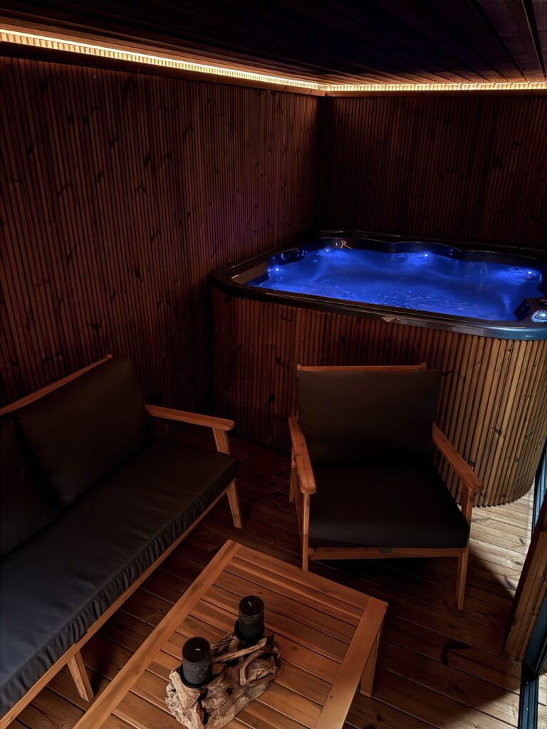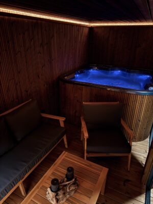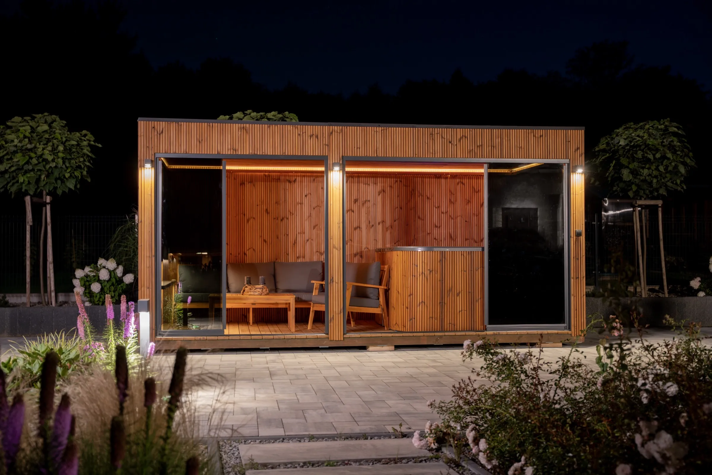 Glass walls, warm LED lighting, and natural materials make every moment spent in the gazebo exceptional. It is a space where you can truly slow down.