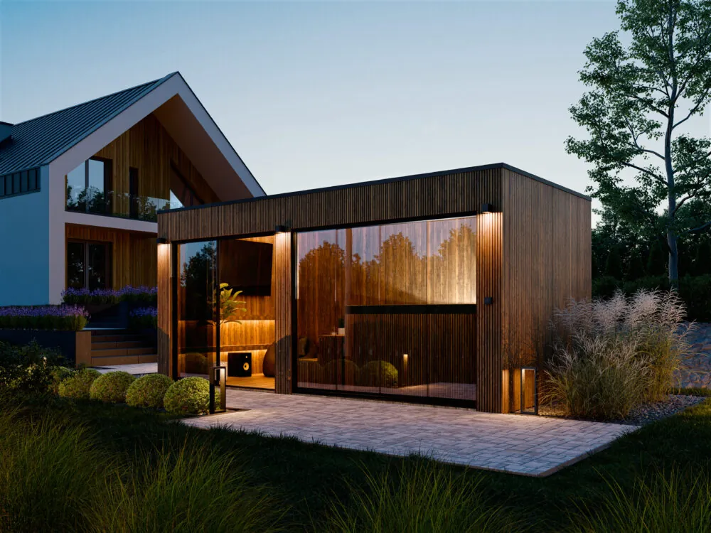 Glass walls, warm LED lighting, and natural materials make every moment spent in the gazebo exceptional. It is a space where you can truly slow down.
