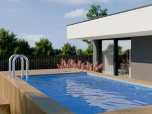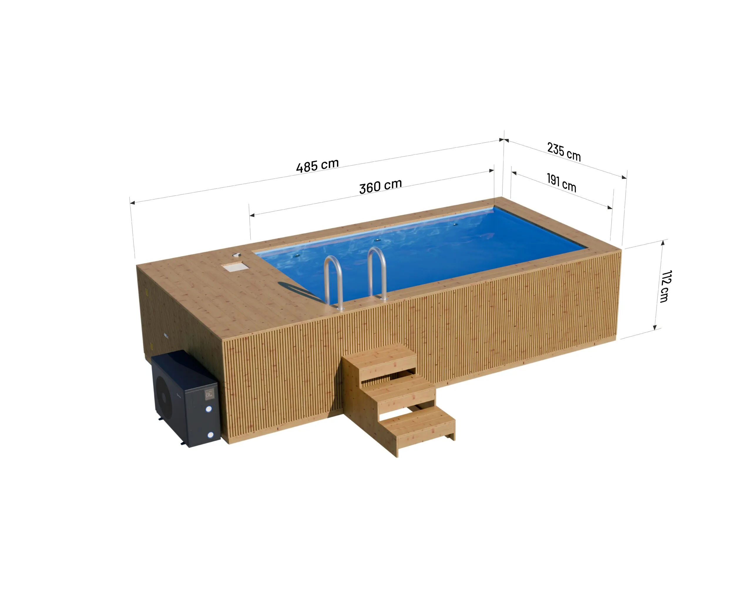 The Premium SPA Pool with Jacuzzi 4.85 × 2.35 m is a fantastic combination of aesthetics with a sturdy and practical design. This model stands out with its minimalist Scandinavian design, allowing us to easily feel comfortable in it and keeping up with current trends. Its interior is filled with a blue center made of polypropylene fiber. While complementing the elegant style of the garden pool, its greatest advantage lies in its invaluable waterproofing. The overall durability is also influenced by the reinforced structure, preventing deformation due to water pressure or weather conditions. The pool is also equipped with wooden steps and a metal ladder to ensure comfortable and safe usage.