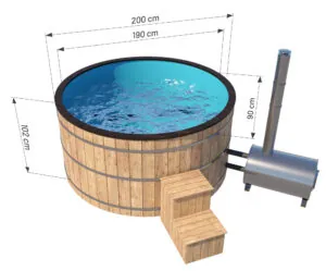 This is a large larch garden hot tub with a diameter of 200 cm equipped with a plastic insert and an external stove. It is a pleasant and relaxing springboard from stressful work.