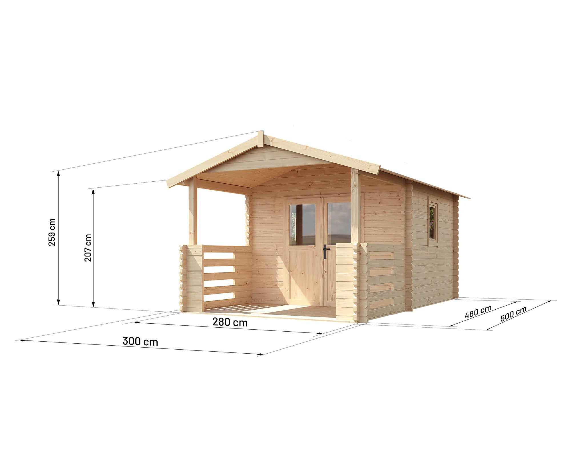 The Zuzia I wooden summer house with dimensions of 3 x 5 m has a spacious, roofed terrace, and the structure is made of sanded boards, planed on four sides from wood with a moisture content of 18%. The thickness of the wall boards is 34 mm, and the floor and roof boards are 18 mm thick. It has a boarded gable roof and a double-leaf door with a single pane, a handle and a lock, and a single-leaf window with a glass thickness of 3mm.